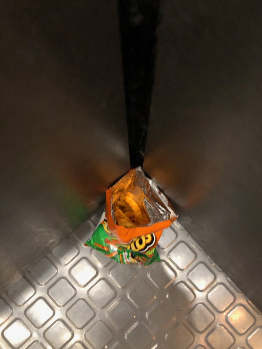 Sometimes in the elevator at college you tire of your single-serve size of Cheddar Jalapeño CHEETOS® and leave them for someone else because it would be too much effort to throw them in one of the trash cans outside the doors on every floor.
