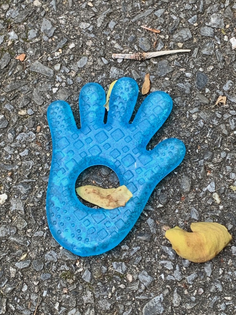 Sometimes at the park your blue hand-shaped teether just gets away from you.