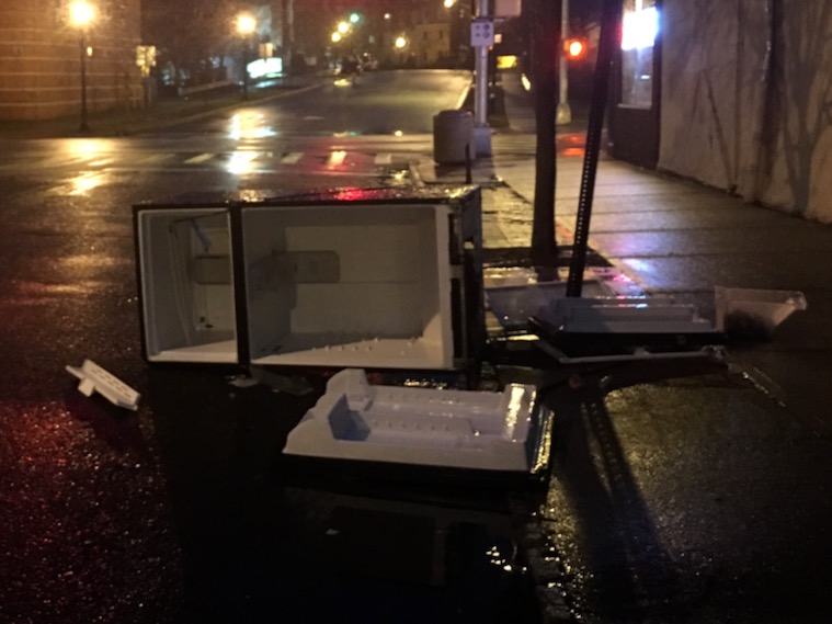 Sometimes at the shopping center your donuts, empty mini liquor bottle, and dog poo bag just get away from you and into a small gutter.