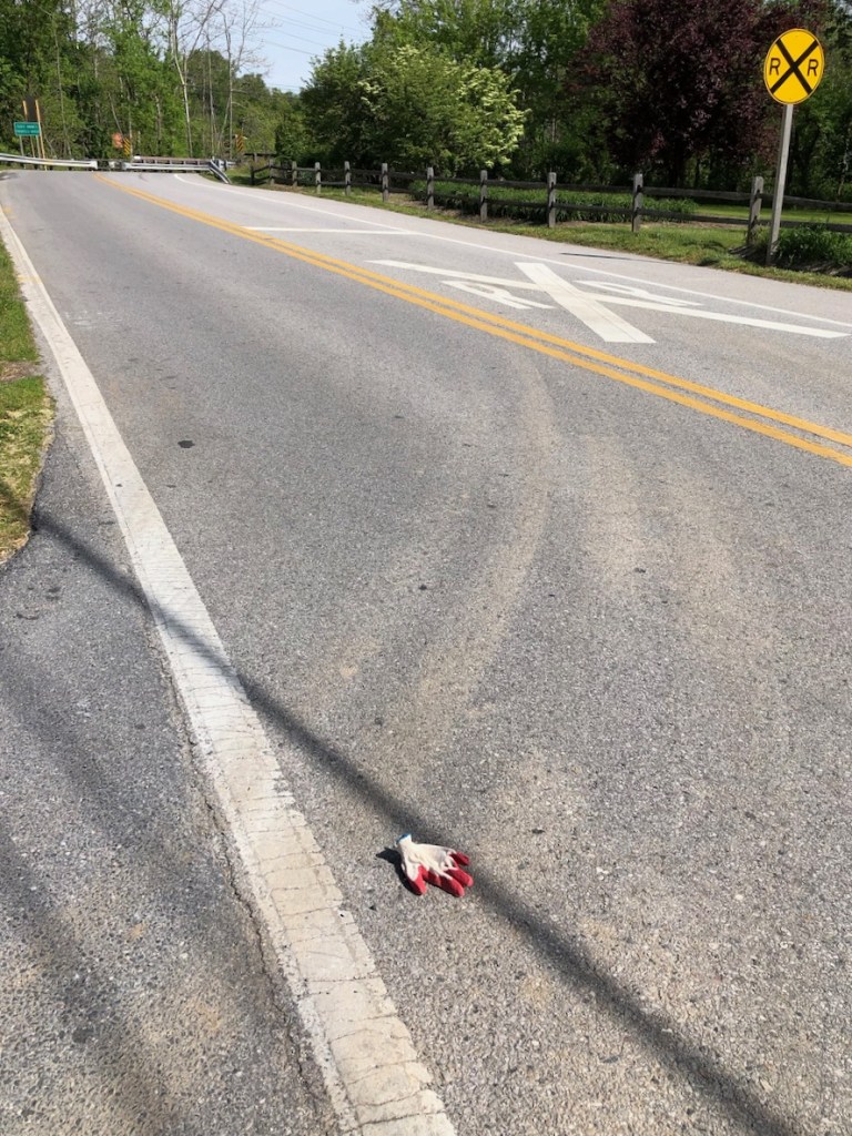 Sometimes on the road near the railroad crossing your rubberized work glove that looks like its covered in blood just gets away from you.